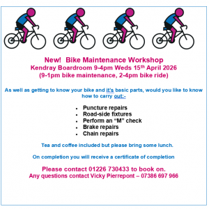 New! Bike Maintenance Workshop Kendray Boardroom 9-4pm Weds 15th April 2026 (9-1pm bike maintenance, 2-4pm bike ride) As well as getting to know your bike and it’s basic parts,...